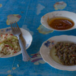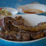 Paluumatkalla, parin päivän päästä, sitten olin jo päättänyt pysähtyä heti kun sopiva koju sattuu kohdalle. Niinpä sitten taas innokkaan viittoilun opastamana kaarsin tiensyrjään ja kävin neuvottelemaan syötävästä. Olin ajatellut, että noissa savuavissa pöntöissä olisi kauan hautunutta lammasta valmiina. Mutta lampaan jalka otettiinkin alas koukusta ja iskettiin lihakirveellä sovitut kolme mojovaa siivua rasvaista lihaa ja laitettiin grilliin. Mausteeksi ei muuta kuin ripaus suolaa. Näppärästi kävi ruoan tilaus ja määrittely ranskaksi. Minä kun en arabiaa osaa.