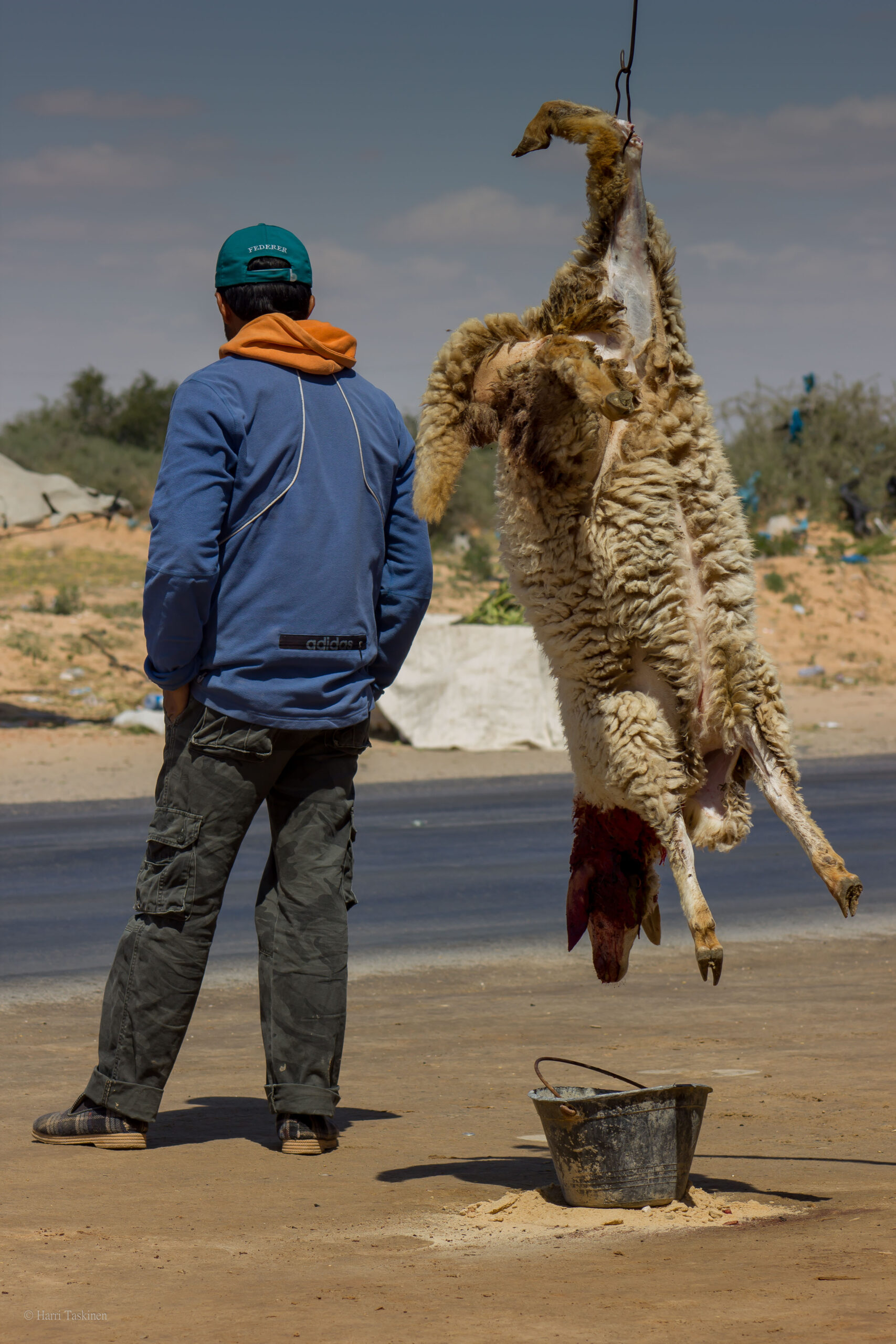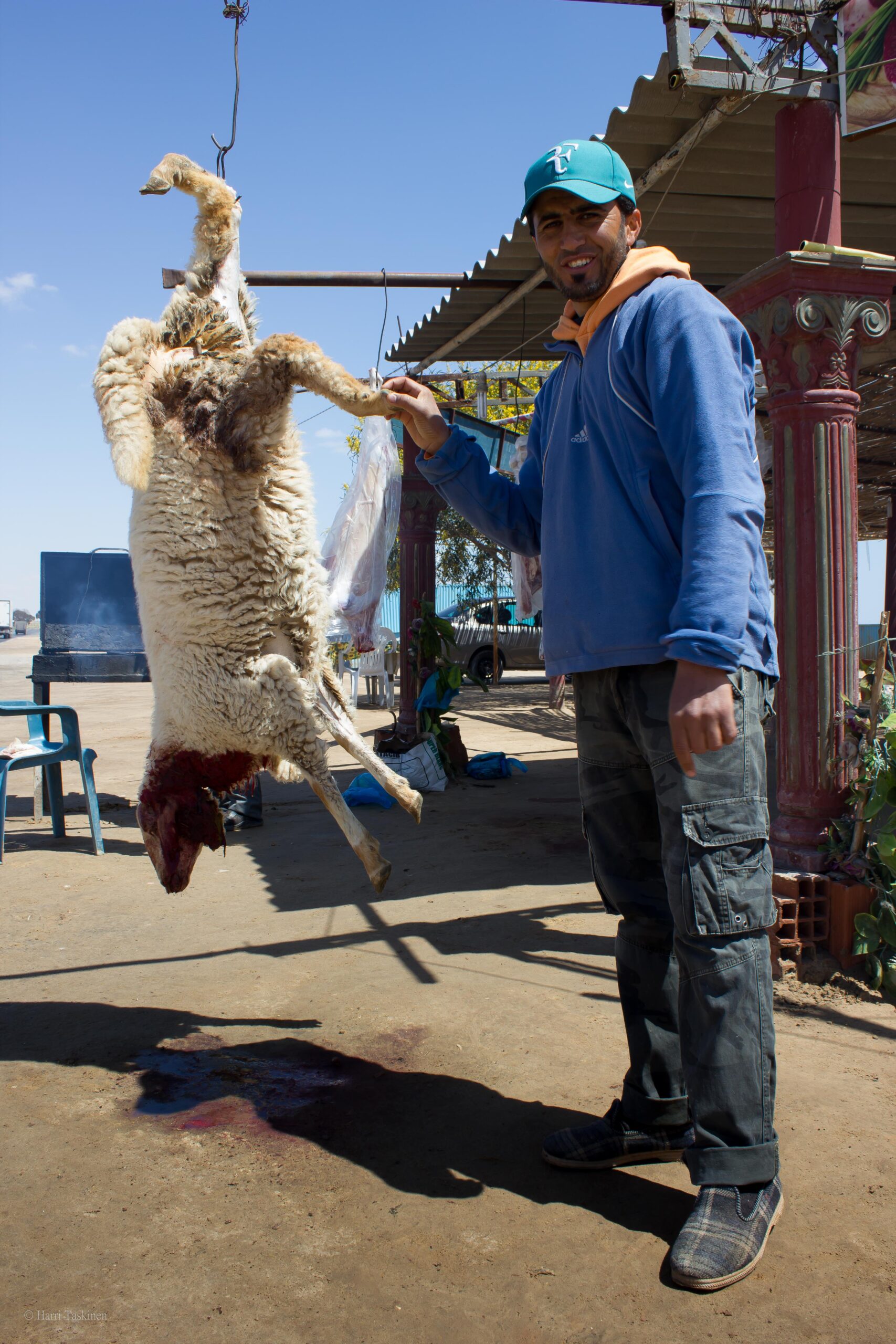 Ajellessani toisena pääsiäispäivänä alas etelään näin eräällä paikkakunnalla teurastettuja lampaita roikkumassa tien vieressä. Osa oli juuri teurastettu – veri valui maahan tai ruhon alle laitettuun astiaan, osa lihasta roikkui puolikkaina paljaaltaan tai muovipusseissa pikku ”ravintolan” edessä telineissään. Lampaan taljoja roikkui vähän joka nurkalla. Kojujen edessä savusi myös grillin näköisiä mustia peltilaatikoita. Miehet viittoilivat innokkaasti pysähtymään. En pysähtynyt.