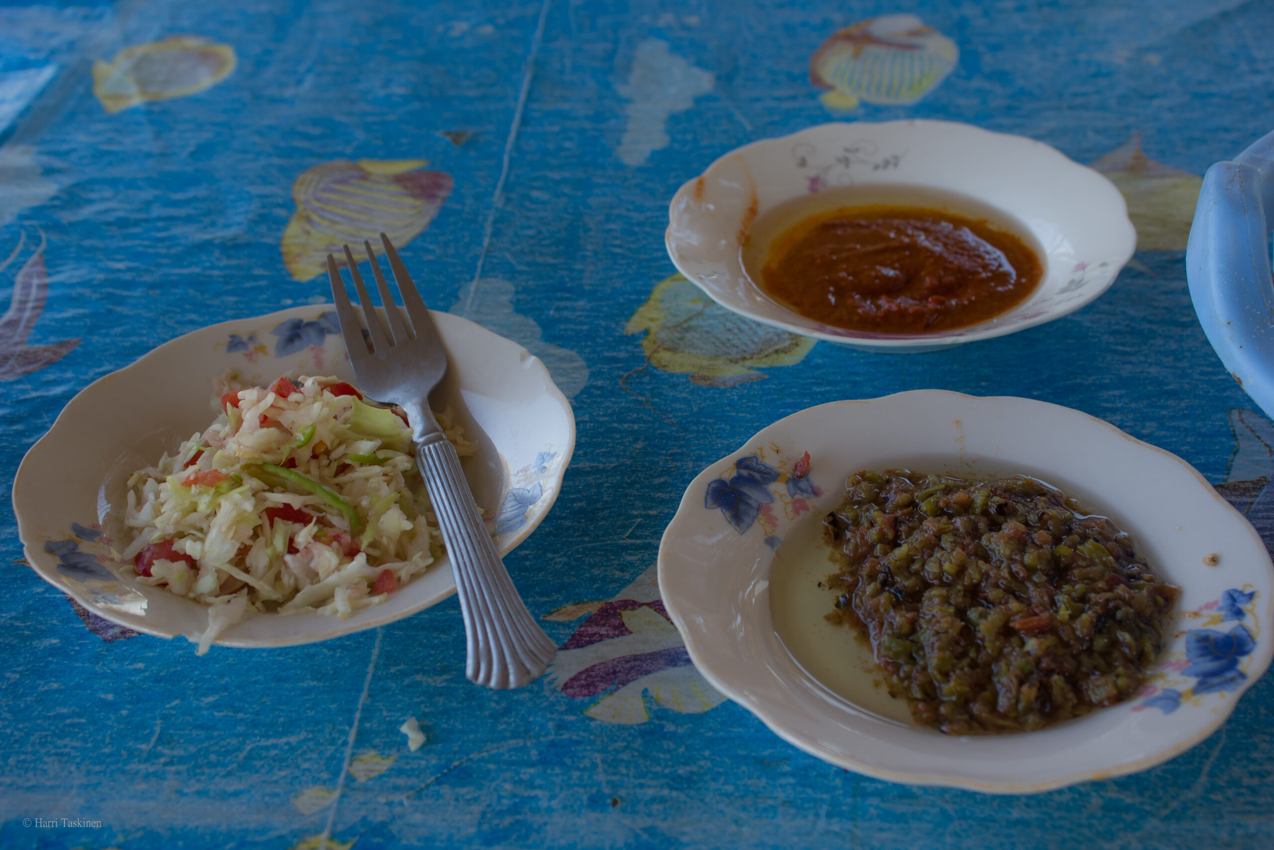 Paluumatkalla, parin päivän päästä, sitten olin jo päättänyt pysähtyä heti kun sopiva koju sattuu kohdalle. Niinpä sitten taas innokkaan viittoilun opastamana kaarsin tiensyrjään ja kävin neuvottelemaan syötävästä. Olin ajatellut, että noissa savuavissa pöntöissä olisi kauan hautunutta lammasta valmiina. Mutta lampaan jalka otettiinkin alas koukusta ja iskettiin lihakirveellä sovitut kolme mojovaa siivua rasvaista lihaa ja laitettiin grilliin. Mausteeksi ei muuta kuin ripaus suolaa. Näppärästi kävi ruoan tilaus ja määrittely ranskaksi. Minä kun en arabiaa osaa.