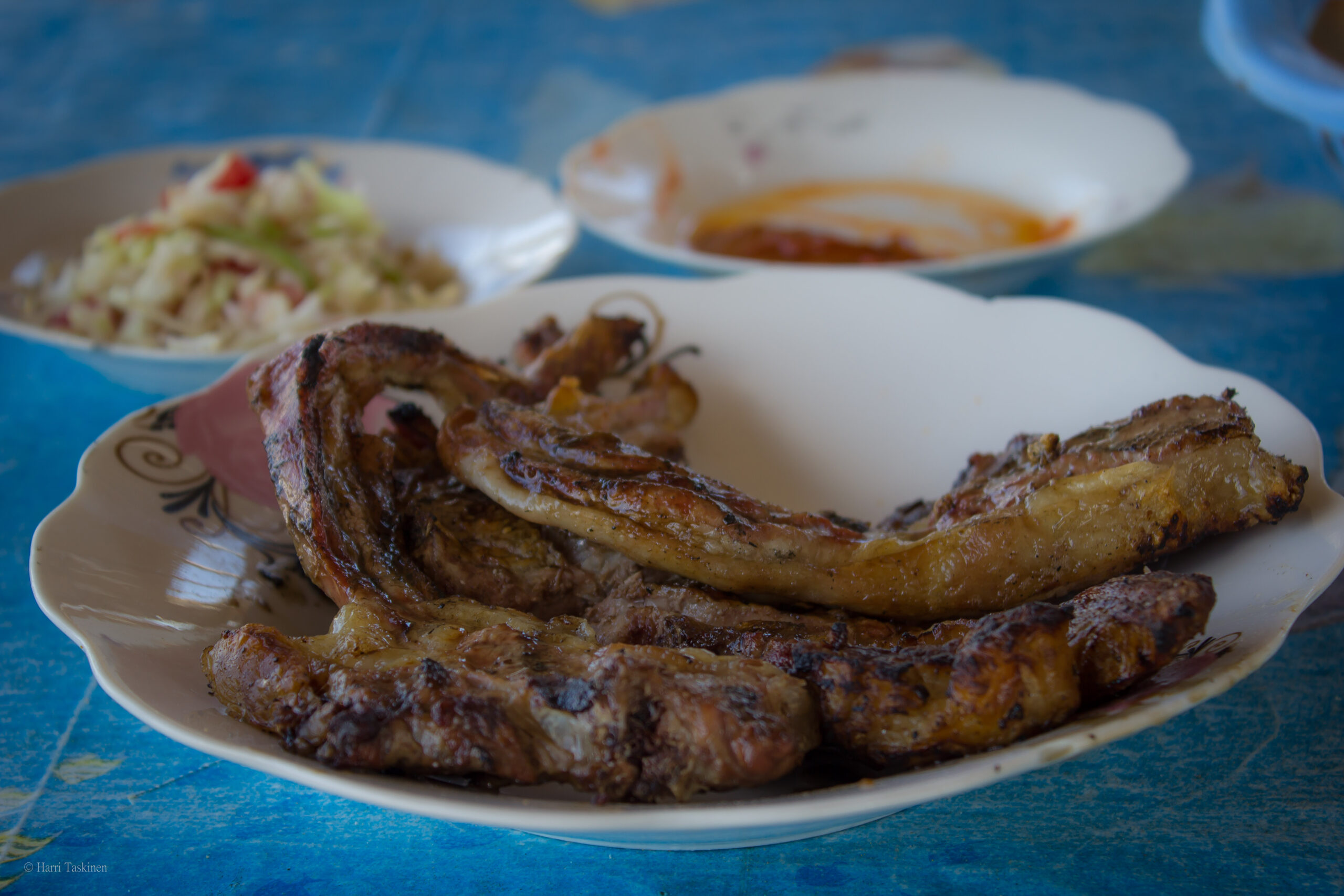 Lihan kypsymistä odotellessa sain leipää, harissaa, oliiveja ja salaattia. Kahvikin käytiin hakemassa autolla läheisestä kahvilasta. Grillistä levisi ruokahalua herättävä tuoksu. Se voitti jopa ohi ajavien rekkojen pakokaasut.